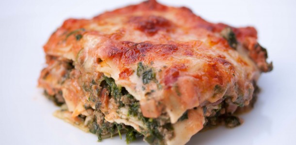 - in einer feuerfesten Schale Hackfleisch mit Spinat, Lasagneplatten und Tomatensoße schichten.