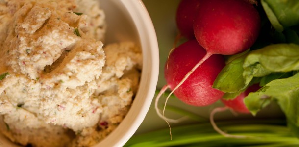 Den Tofu zerkleinern, Radieschen und Schnittlauch klein schneiden und mit allen weiteren Zutaten pürieren. Mit Kräutersalz, Cayennepfeffer und frischem Pfeffer abschmecken.