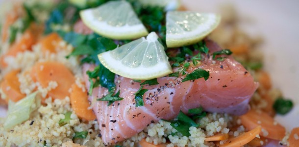 - Couscous mit einer Gabel auflockern und in die Mitte von 4 Backpapierbögen (à 42 x 38 cm) verteilen, Lachs darauf setzen. Zitrone in 6 Scheiben schneiden, halbieren und auf dem Lachs verteilen. Backpapier wie ein Bonbon darüber zusammenfalten, Enden fest zudrehen.